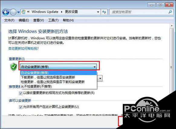 3、接下来进入“更改设置”将重要更新选择为“自动安装更新(推荐)”,完成后,点击底部的“确定”保存,如下图所示。