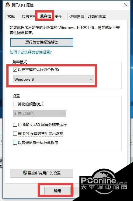 从打开的“腾讯QQ 属性”窗口中,切换到“兼容性”选项卡,勾选“以兼容模式运行这个程序”项,同时设置相应的 系统 (通常可选择Windows8),点击“确定”按钮。