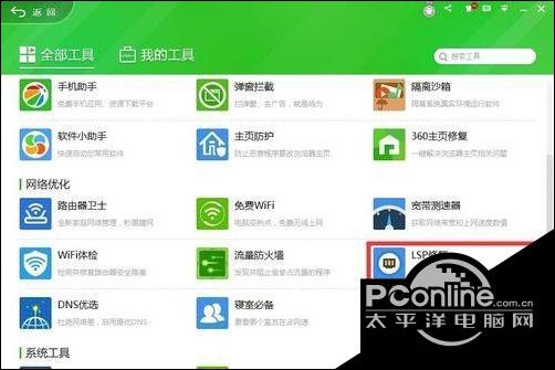 打开“360安全卫士”程序,在“更多功能”列表中找到“LSP修复”工具点击运行。