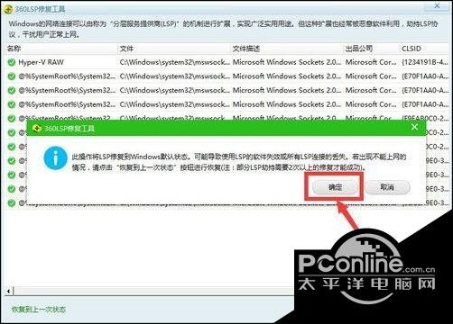 接着从打开的“360LSP修复”工具主界面中,点击“立即修复”按钮,并在弹出的窗口中点击“确定”以完成电脑LSP修复操作。