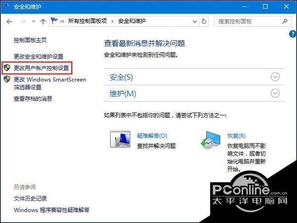 3、在打开的安全和维护界面左侧点击【更改用户账户控制设置】;