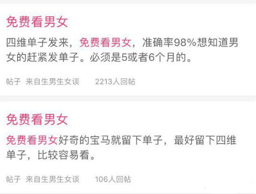 然后我就试着发了一个帖子,免费看男女,准确率99%! 还真别说,真有人问,还有一个人加了我微信。当时高兴死我了。但是悲伤的事总是来得很突然,后来我刷新的时候,一看帖子被删了,号也被封了。