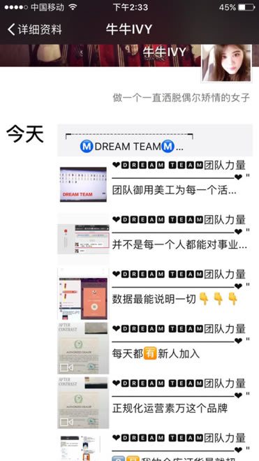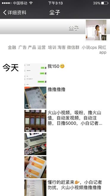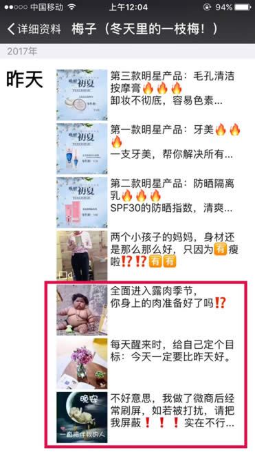 这种类型的微商我断定,百分之99不懂引流,号上最多百来个人,而且还都是现实中的亲朋,所以这种类型的微商做着做着很快就会销声匿迹,总之最终一定会失败,毫无成功机会可言。