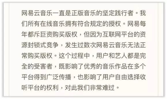 云音乐在负面公关的过程中,把锅甩到所谓的“资源封锁式竞争”上,将自身置于受害者和“为群众谋利”立场下。你瞧,很熟悉的网易式公关风格