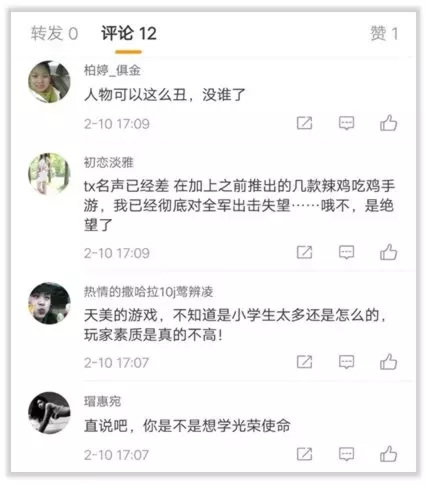 但网易的水军也真是多,腾讯吃鸡手游刚上的时候,经常能在相关的话题下面看到乌泱乌泱的网易水军。于是0转发的微博也会突然引来几十个水军刷评论。