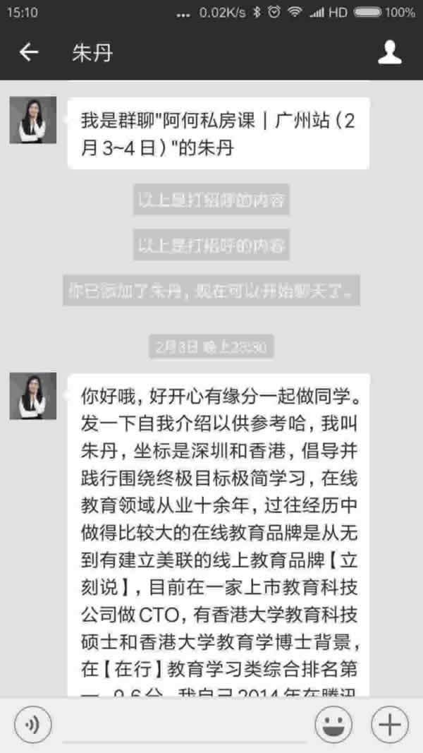下面是她加我后的截图,因为我们是同一个付费课程的同学(这个课程收费5800元,所以同学认可度和信任度比较高),所以我通过很快: