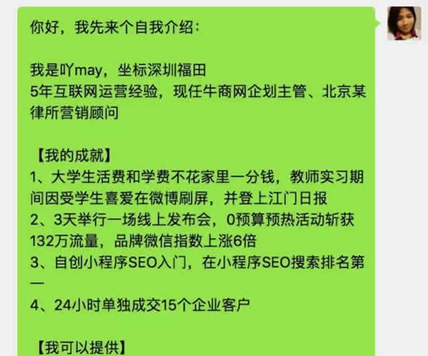 自我介绍——这非常重要,自我介绍中你要塑造出自己的价值,并告知自己可以为对方提供什么,例如自我介绍是这样的: