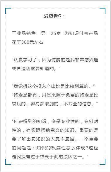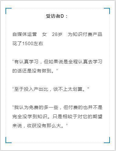 从几位采访者的表述来看,他们普遍认为,知识付费是一个学习的好机会,抛开结果,付费本身会对学习产生一种约束力。但谈到投入与产出比,多数人则认为两者并不能呈正相关。课程购买之前,对内容权威的不确定性,也成为他们选择知识付费的一个制约因素。
