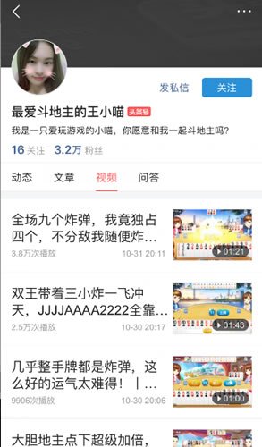 在观察这个头条号的时候,还发现了这个号主运营了另外一个头条号,内容是类似的,连头像也是一样,可能就是视频不是同一局的,另外一个头条号名字叫做:最爱斗地主的王小喵,如果是想做类似自媒体头条的朋友可以搜搜这两个头条号,仔细观察一下是怎么做的。