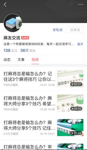 这个头条号呢,跟上面两个有些不同,形式主要是以输出干货性质的知识为主。比如说“打麻将经常输怎么办,麻将大师教你3个技巧,记住就不会再输了;打麻将输赢与什么有关?麻将大师说掌握这5个技巧以后打牌都不会输等等”。