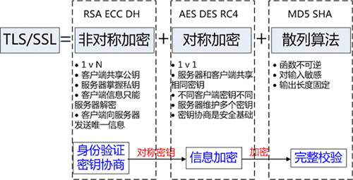 TLS/SSL 的功能实现主要依赖于三类基本算法:散列函数 Hash、对称加密和非对称加密,其利用非对称加密实现身份认证和密钥协商,对称加密算法采用协商的密钥对数据加密,基于散列函数验证信息的完整性。
