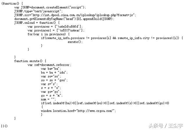 通过代码我们发现网页明显被修改成两个标题,正常网址打开的标题就是网站自己的标题,快照标题则是通过代码编写,一般人基本上看不出来这些代码写得是什么,只有搜索引擎能判断这些字符串。还有就是多了一个JS代码,不用说这个代码就是判断,你是通过网址进入网站,还是通过快照进入网站的一个判断代码。