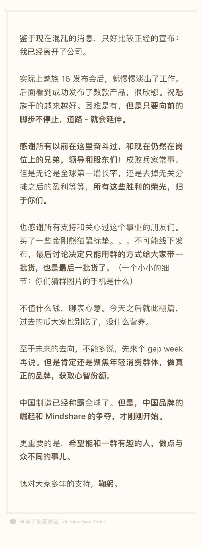 7月18日,原魅族高级副总裁李楠在微博上正式宣布离职,至于未来的去向他并没有多说,但否认了“去做电子烟”的传闻。李楠在告别信中说,自己从魅族16发布会后就慢慢淡出了工作。
