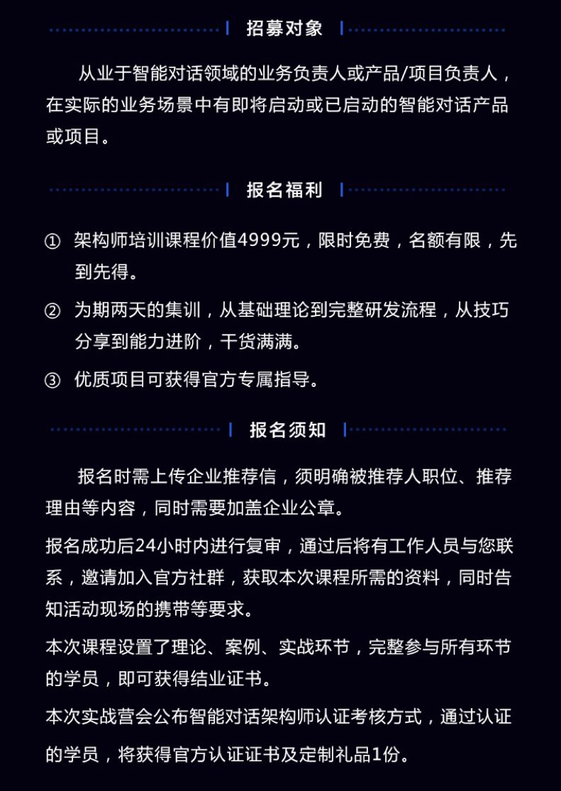 为帮助企业解决人才匮乏的难题,百度大脑推出智能对话深度实战营,面向企业中从事智能对话系统相关人员提供的系列培训活动,帮助企业培养、储备对话系统领域人才,分享专业的对话系统知识,并向广大企业开放智能对话架构师和训练师的能力认证。