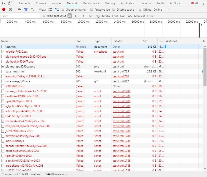 C:\vWeChatFiles文件夹下会有一个test2.html文件,在chrome中打开,网页可以正常显示了,但是开发者工具中依然显示有许多请求是红字状态,先不用管。