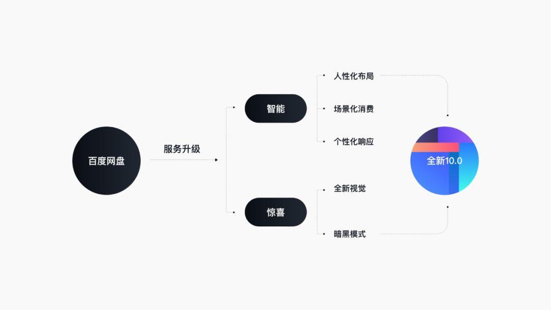 以上,是百度网盘10.0服务升级背后的原因以及思考过程。从前期明确产品方向-“服务化”,到梳理出“服务”给人传递的感受(智能、惊喜),再到“智能”落地到产品中的三个方向(人性化布局、场景化消费、个性化响应),以及“惊喜”落地到产品中的两个部分(全新视觉、暗黑模式),最终呈现出的全新服务体验的10.0升级。所做一切,都是为了给用户持续提供更好的体验。
