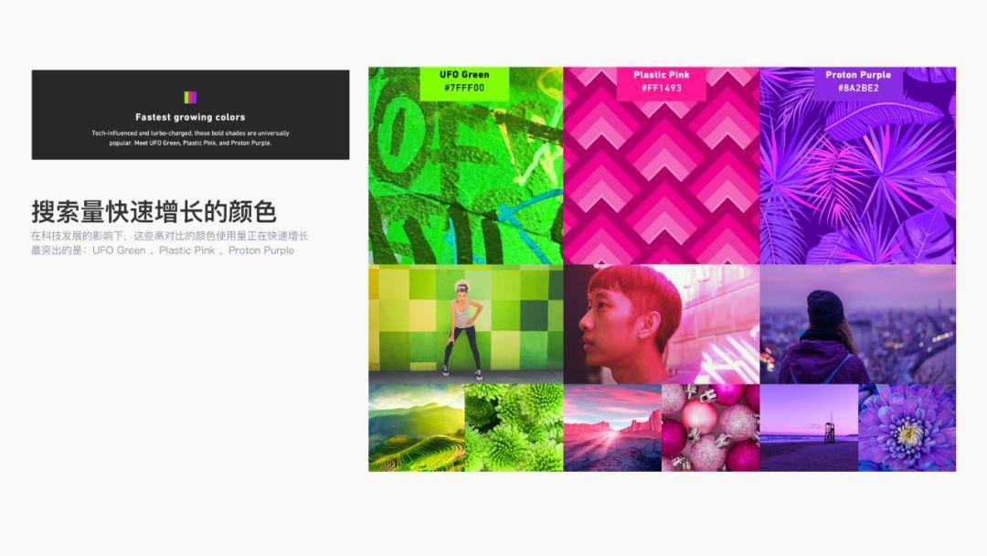 通过折叠像素数据和十六进制编码,2019年Shutterstock平台能够看到用户下载最频繁的颜色。利用这些信息,他们编制了一份全球最受欢迎的三种颜色。可以看出,在科技发展的影响下人们对高饱和和渐变色的青睐日益增长,最突出的是:UFO Green、Plastic Pink、Proton Purple。