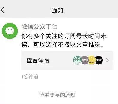 微信方面表示,有的用户长时间不阅读的订阅号过多,这些帐号存在用户的消息列表中会影响用户对内容的筛选效率。因此,希望通过提醒用户关闭不感兴趣的订阅号的推送,以达到提升阅读效率和体验的目的,关闭文章推送不等于取消关注该公众号。