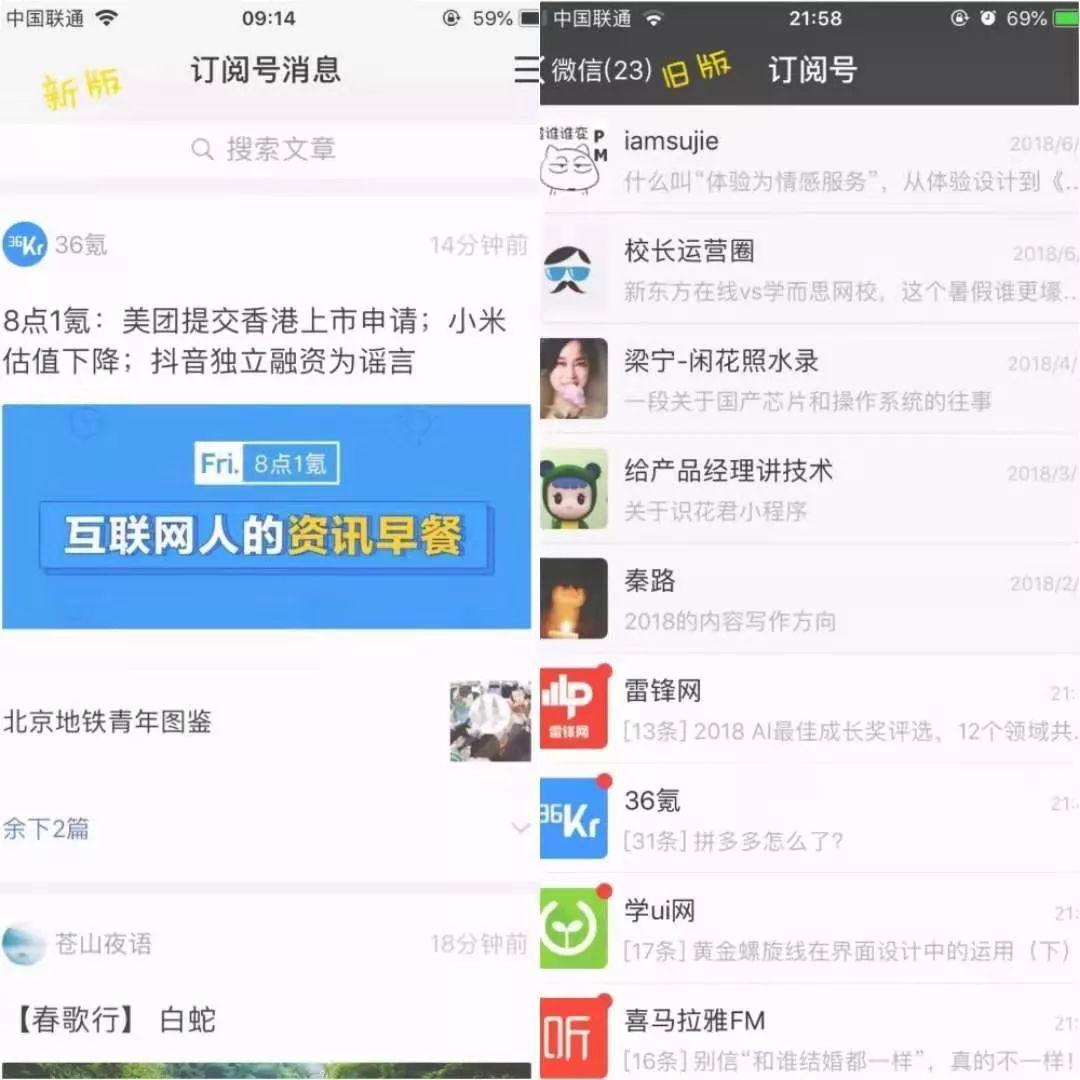 旧版是先看品牌(选择公众号),再看商品(再根据文章图片标题等决定是否要消费这篇文章);而新版则是直接看商品(公众号、标题、图片、好友阅读数量构成这个文章的吸引力)。