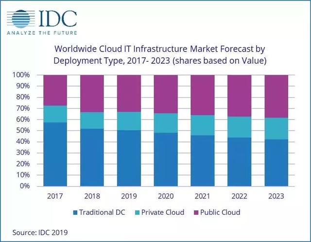 终于,IDC 最近发布的《全球云计算IT基础设施市场预测报告》显示:2019 年全球云上的 IT 基础设施占比超过传统数据中心。
