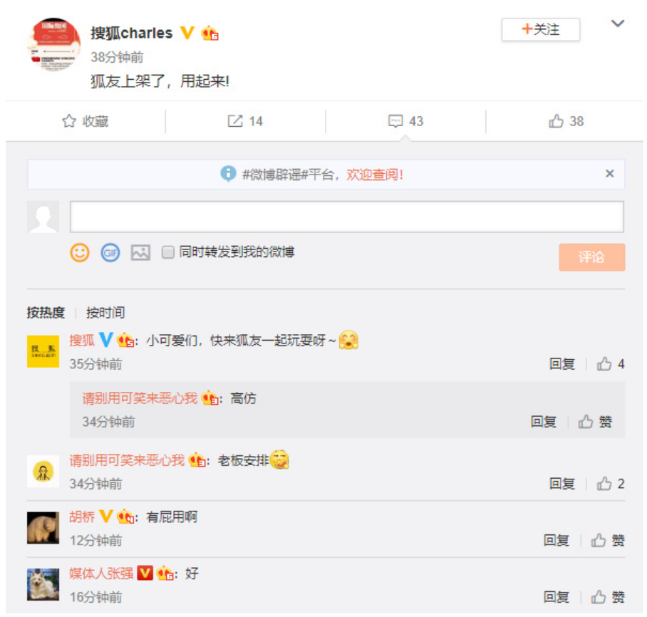 搜狐公司CEO张朝阳在微博宣布,搜狐社交产品狐友App重新上架。