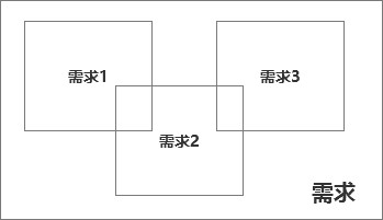 比如把下图的大矩形比作一个需求方案,小正方形比作拆解的需求点,那么这样的形式来描述这个需求就不符合MECE原则,因为三个小正方形之间有交叉重叠部分,且组合起来没有完全填满整个矩形。
