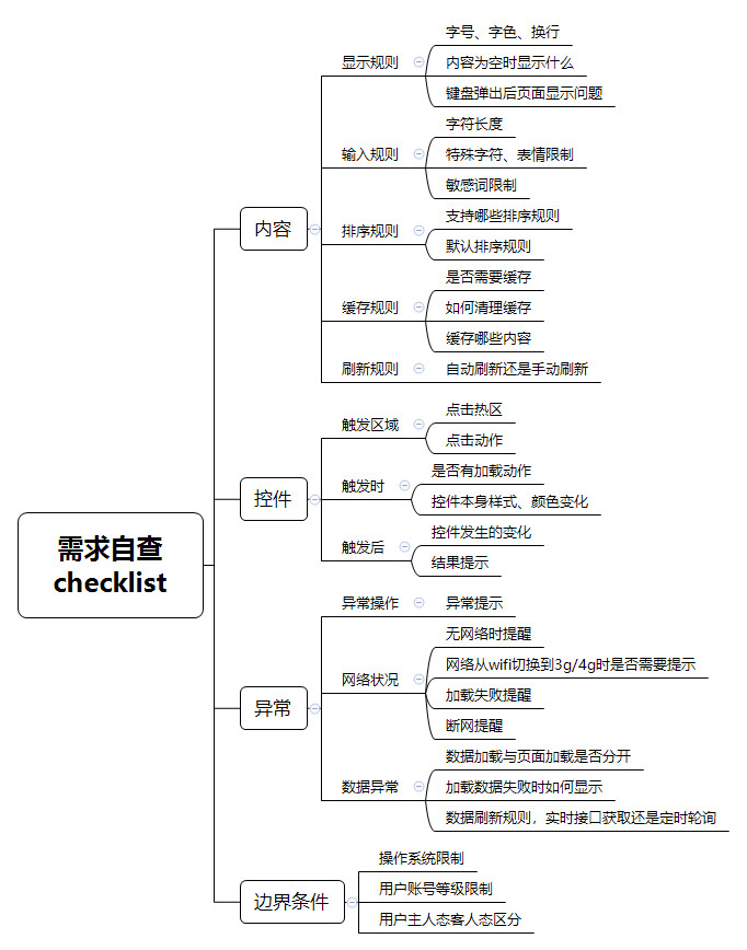 通过上述三个层面的考虑,基本可以保证一个页面的需求不遗漏,但是可能对很多异常流考虑程度不够,还可以用一份详细的需求自查表来check,验证一下是否覆盖了大部分异常情况。