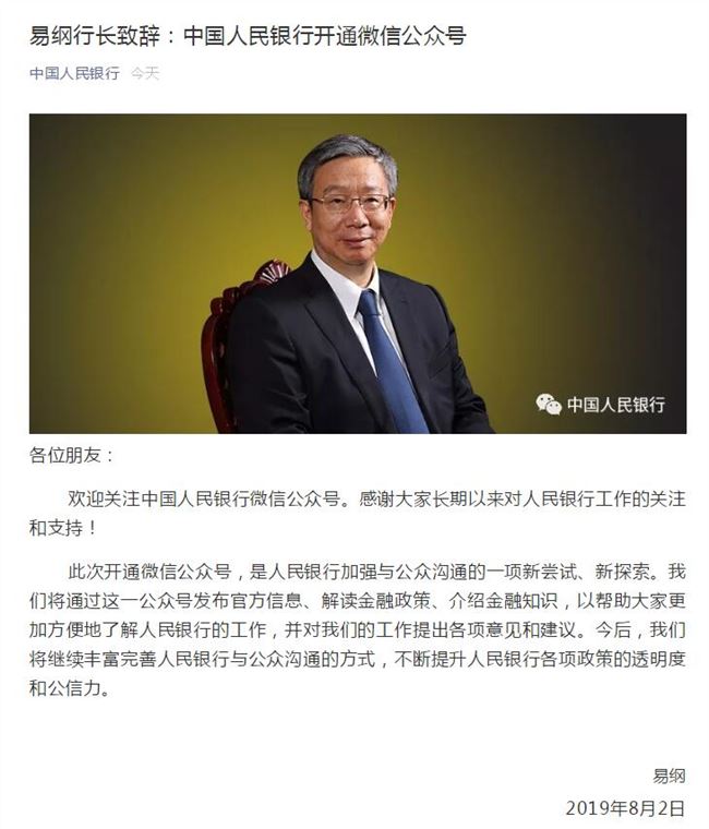 站长之家(ChinaZ.com) 8月2日 消息:今日,中国人民银行宣布正式开通微信公众号。中国人民银行行长易纲表示,将通过这一公众号发布官方信息、解读金融政策、介绍金融知识,以帮助大家更加方便地了解人民银行的工作,并对我们的工作提出各项意见和建议。
