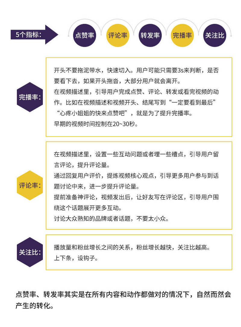 第二要持续更新内容,最开始更新的频率一定要稳定,要展示自己持续的生产能力,才可以得到用户的关注,但是想要涨粉还要看算法推荐的指标:点赞、评论、转发、完播率以及关注比。