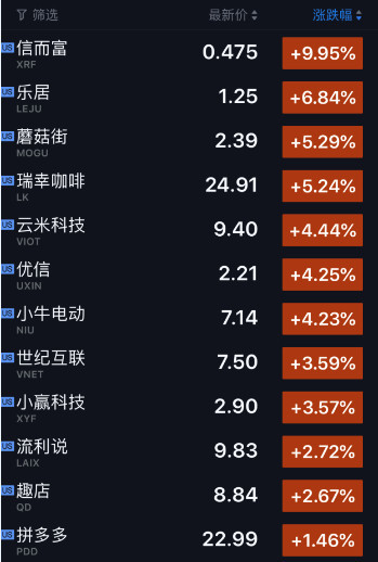 另一方面,涨幅较大的公司包括:信而富(涨9.95%)、乐居(涨6.84%)、蘑菇街(涨5.29%)、瑞幸咖啡(涨5.24%)、云米科技(涨4.44%)、优信(涨4.25%)、小牛电动(涨4.23%)、世纪互联(涨3.59%)、小赢科技(涨3.57%)、流利说(涨2.72%)、趣店(涨2.67%)。