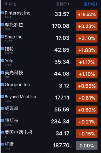 另一方面,涨幅较大的公司包括:Pinterest(涨18.62%)、摩托罗拉(涨3.23%)、Snap(涨2.10%)、Twitter(涨1.83%)、Yelp(涨1.17%)、美光科技(涨1.10%)。