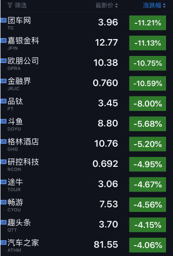 中国概念股多数下跌,其中跌幅较大的公司包括:团车网(跌11.21%)、嘉银金科(跌11.13%)、Opera(跌10.75%)、金融界(跌10.59%)、品钛(跌8.00%)、斗鱼(跌5.68%)、格林酒店(跌5.20%)、研控科技(跌4.95%)、途牛(跌4.67%)、畅游(跌4.56%)、趣头条(跌4.15%)、汽车之家(跌4.06%)。