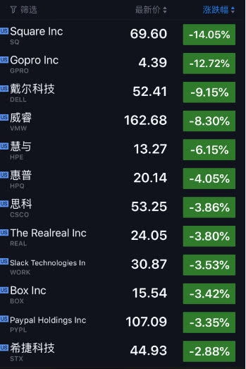 美国科技股全线下跌,其中跌幅较大的公司包括:Square(跌14.05%)、Gopro(跌12.72%)、戴尔(跌9.15%)、VMware(跌8.30%)、慧与(跌6.15%)、惠普(跌4.05%)、思科(跌3.86%)、The Realreal(跌3.80%)、Slack(跌3.53%)、Box(跌3.42%)、Paypal(跌3.35%)、希捷(跌2.88%)。