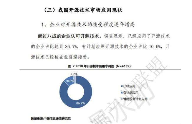 今年早些时候国内发布的《开源产业白皮书(2019 年)》曾指出,全球开源产业链已经形成,而国内已经应用了开源技术的企业占比达到 86.7%,有计划应用开源技术的企业占比 10.6%,开源技术已经被企业普遍接受。但同时,开源技术也存在一定的风险,中国企业和开发者也需要审视开源所涉及的风险。