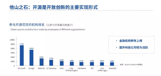 他提到,BAT 等企业正在积极开源,但未来参与度还有进一步提升的空间,排名第一的微软通过拥抱开源的战略,过去几年的业务获得了突飞猛进的效果,“在过去,他们是相对封闭的,但一旦走向开源之路,成效就非常明显”。