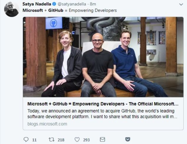 图丨微软 CEO 纳德拉在 Twitter 评价称:微软+GitHub=为开发者赋能(来源:Twitter)