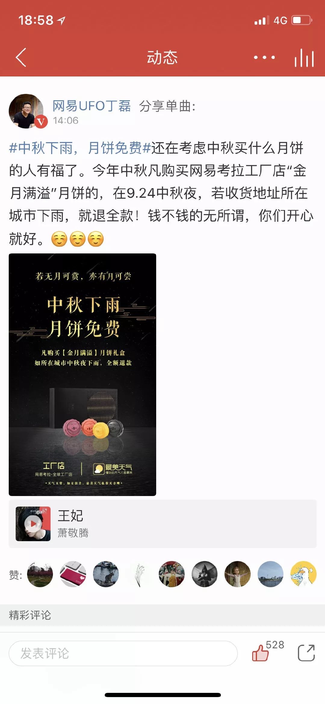 为了卖月饼,他们策划了一场“中秋下雨,月饼免单”的营销活动,顾名思义,就是买了月饼的顾客,如果所在城市中秋节当晚下雨,那么网易考拉将会退款给消费者。