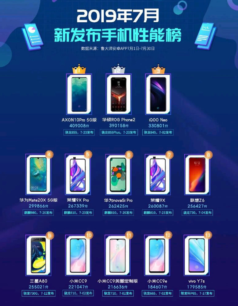 近日,评测机构鲁大师发布了《2019年7月新发布手机性能榜》,涉及7月1日7月30日发布的新款安卓手机。跑分数据显示,中兴天机AXON 10 Pro排名第一,华硕ROG Phone 2其次,iQOO Neo则位列第三。