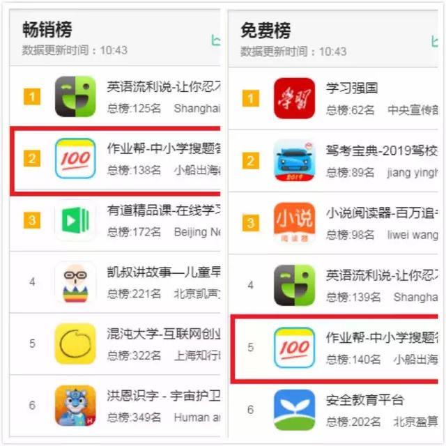 如图,根据七麦数据的实时榜单排名显示,作业帮在畅销榜中排名第二,而在免费榜单中排名第五。