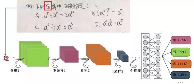 如图,经过OCR预处理并分割之后,对一个文字而言,基于深度学习方法的识别,首先对其进行卷积操作提取特征,而后进行下采样操作,保留更重要的特征,而后继续进行卷积和下采样操作之后,将最后一层下采样操作获得的特征输送至全连接层进行处理并最终输出其概率分布,从中可见,最终以98%的置信度对当前文字判定为“运”。对其它文字的识别亦同理,当前基于深度学习的文字识别,算法准确率通常达到99%以上。