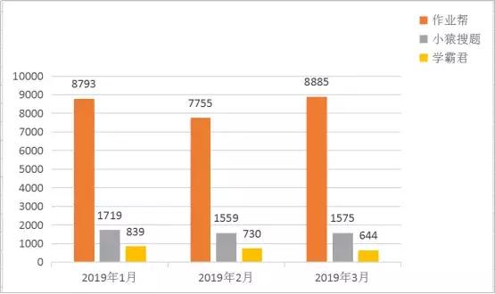 同时,根据艾瑞数据显示(图中垂直坐标轴单位为万台),作业帮的月活,和同类型的产品如小猿搜题、学霸君相比之下,其排名为第一,且领先的优势比较明显。