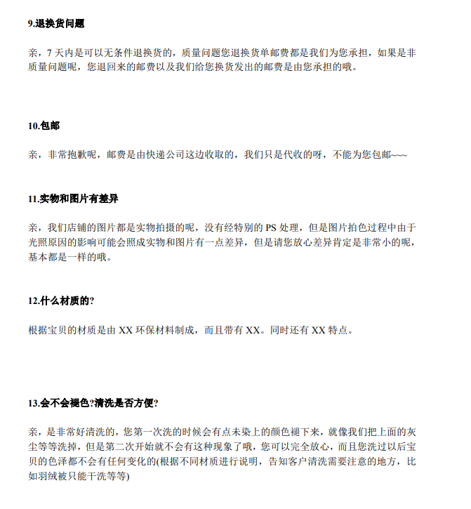 上面我说过了,客服每天的压力非常大,虽然话术都大致相同,但是很少有整理得这么完整的。各位可以直接复制在快速回复里面,这样可以大大提高接待效率。用更加专业的回复,提高转化率。