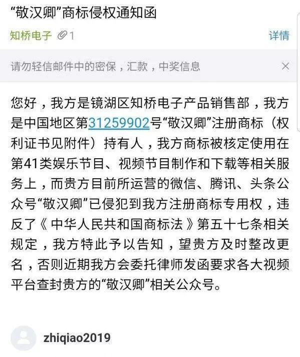 在「敬汉卿」收到的“侵权通知函”中,对方强调如若「敬汉卿」不改名,他们会委托律师函要求各大视频平台查封「敬汉卿」相关账号。