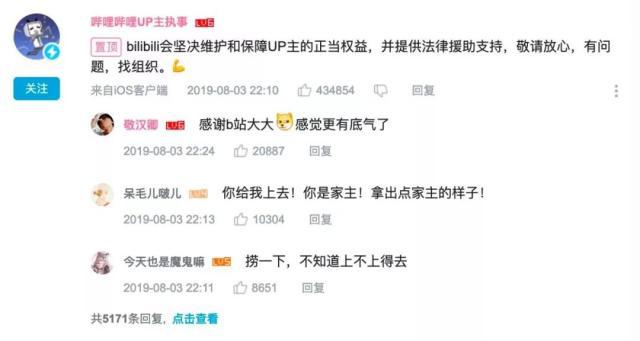 除此外,此次事件中,B站官方账号在敬汉卿的视频下留言:坚决维护和保障UP主的正当权益,并提供法律援助支持。