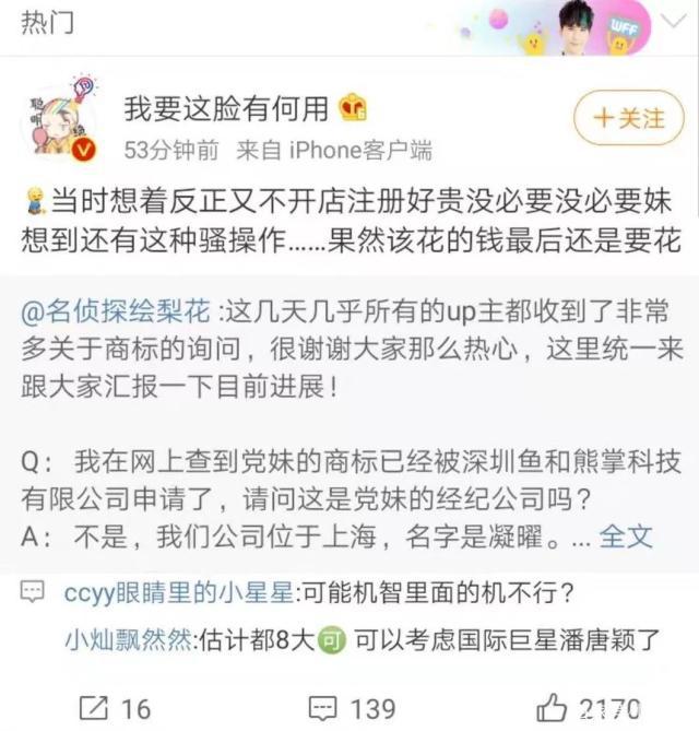 “当时想着反正又不开店注册,(商标注册)好贵,没必要没必要,没想到还要这种骚操作……果然该花的钱还得花” ,「机智的党妹」在微博上回应了粉丝对她商标“安全”的关心。(@我要这脸何用 为其微博昵称)