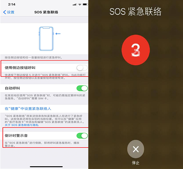 返回页面时记住要打开页面中的“使用侧面呼叫按钮”和关闭“倒计时提示音”,这样出现问题只要连续按5次电源键就可以自动拨打求救电话了!