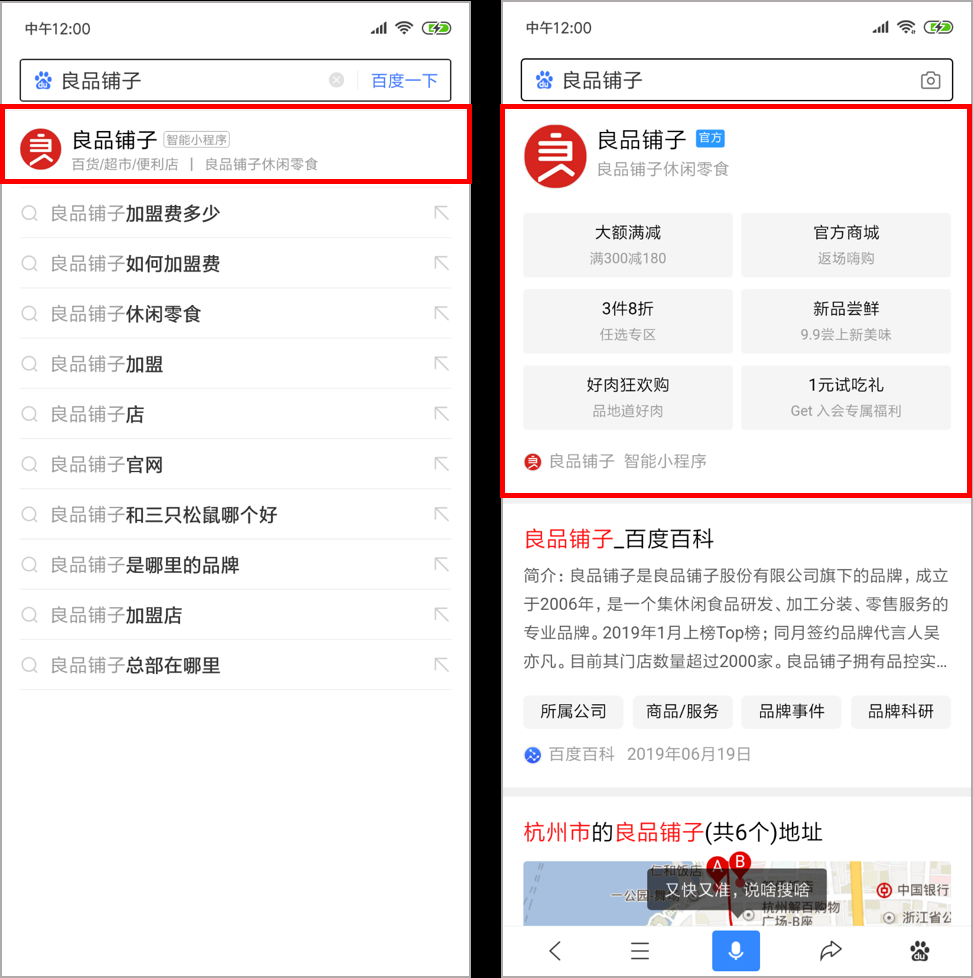 以良品铺子为例,其本身有足够的知名度,每天都有巨大的百度品牌关键词搜索量。通过有赞接入百度智能小程序,消费者无论是主动搜索“良品铺子”,还是从百度信息流的推荐位中,都可以直接跳转到良品铺子小程序下单购买。这将给品牌方带来巨大的用户增量和销售增量。