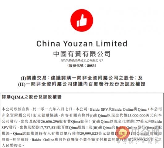 外汇天眼APP讯 : 8月8日,中国有赞(08083.HK)发布公告称,中国有赞控股的实体获得来自百度的投资。