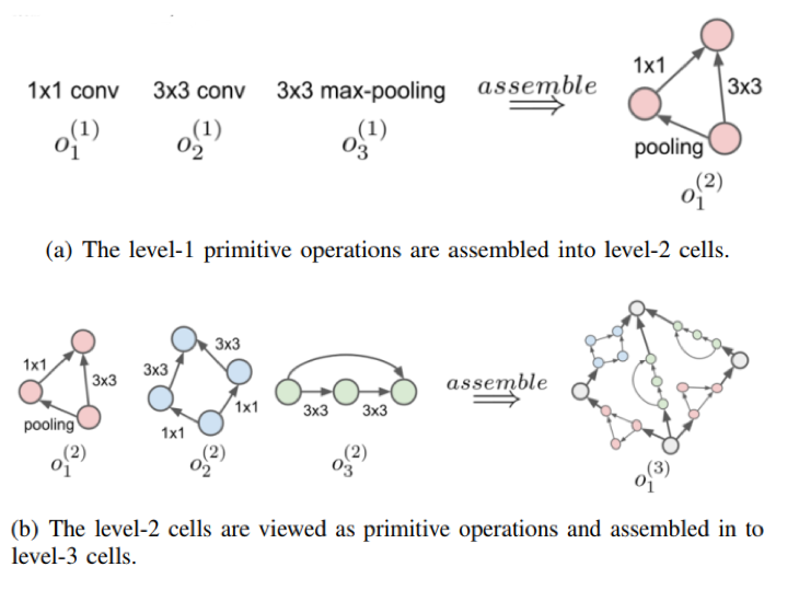 不同于上面将单元结构按照链式的方法进行连接,层次结构是将前一步骤生成的单元结构作为下一步单元结构的基本组成部件,通过迭代的思想得到最终的网络结构。如下图所示,(a)中左边3个是最基本的操作,右边是基于这些基本操作生成的某一个单元结构;(b)中左边展示了上一步骤中生成的若干个单元结构,通过按照某种策略将这些单元结构进行组合得到了更高阶的单元结构。