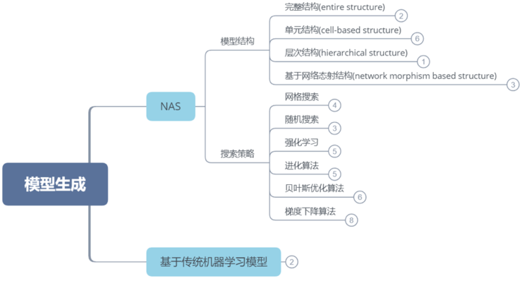 模型生成的方式主要有两种:一是基于传统的机器学习方法生成模型,例如SVM,decision tree等,已经开源的库有Auto-sklearn和TPOT等。另一种是是神经网络结构搜索(NAS)。我们会从两个方面对NAS进行总结,一是NAS的网络结构,二是搜索策略。